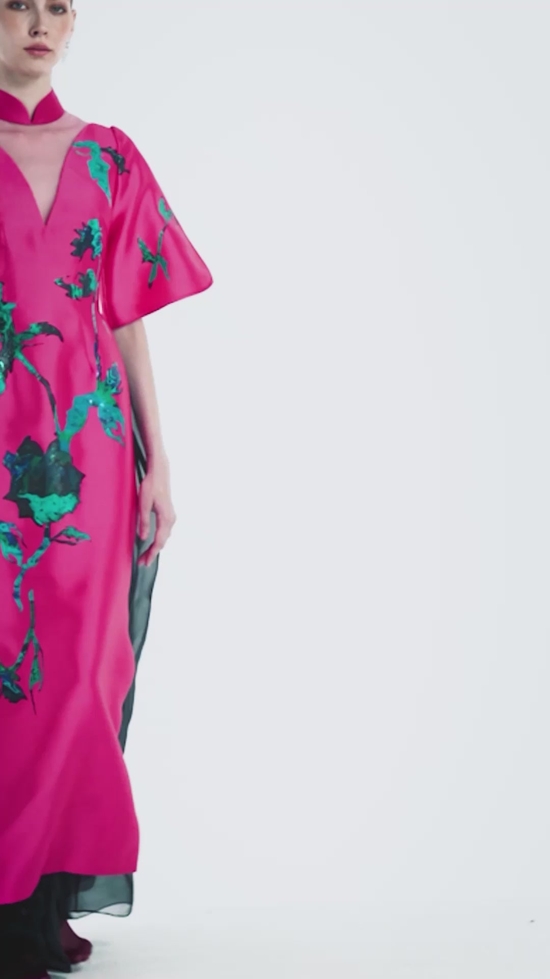 A bold statement in contemporary fashion, Celestial Vanguard reimagines the traditional Ao Dai with a dynamic modernity. This design is inspired by the celestial splendor of the cosmos, hidden within the delicate beauty of blooming flowers, blending vibrant artistry with a forward-thinking silhouette. The hand-painted teal floral motifs bring life to the energetic Fuchsia Radiance fabric, creating a vivid interplay of contrast and harmony.