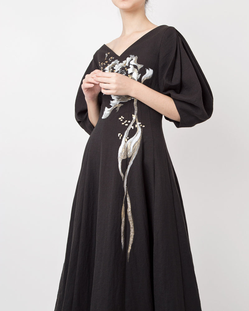 Wildflower-painted Voluminous Sleeve Midi Dress