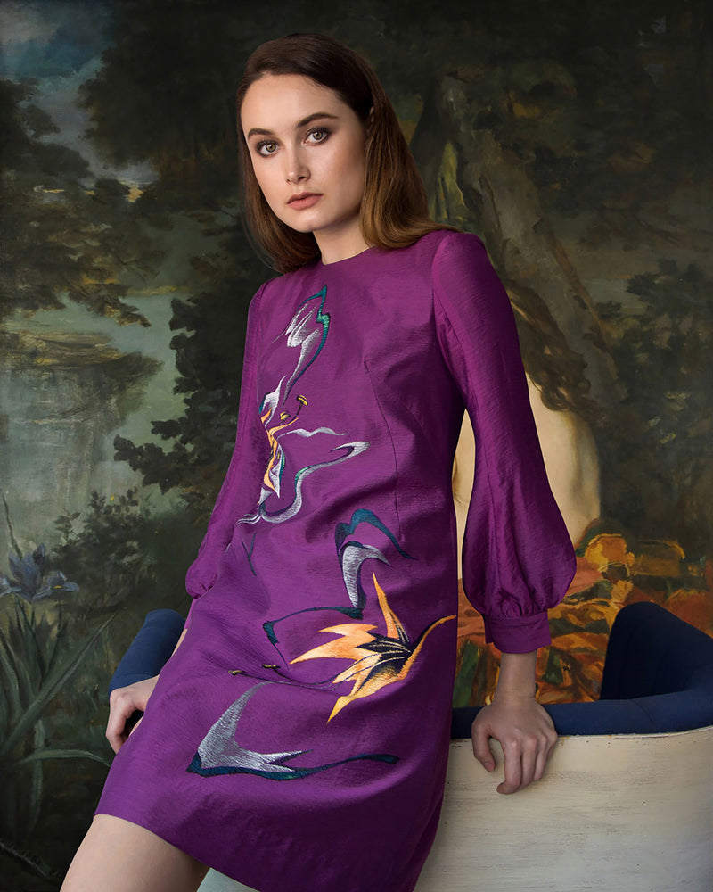 Amaryllis-painted Puff Sleeve Purple Mini Dress