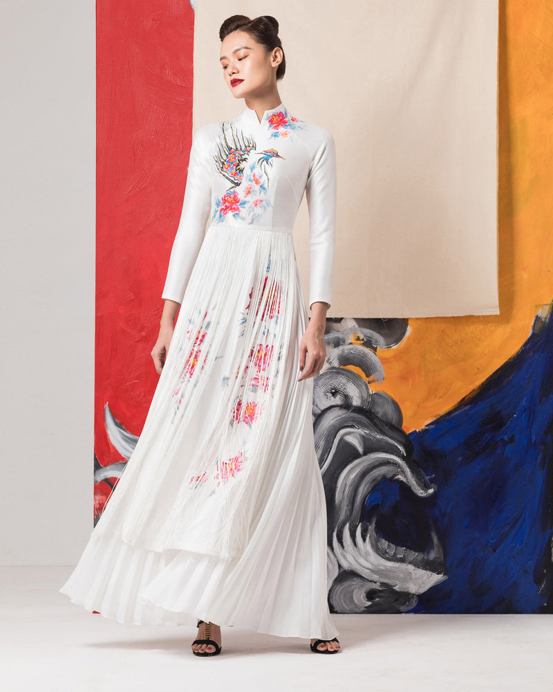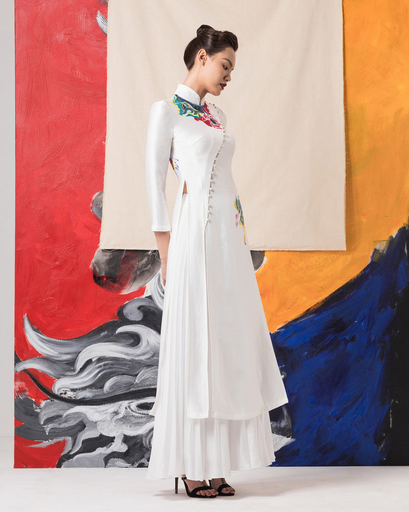 Phoenix-painted Raglan Sleeve White Contemporary Ao Dai