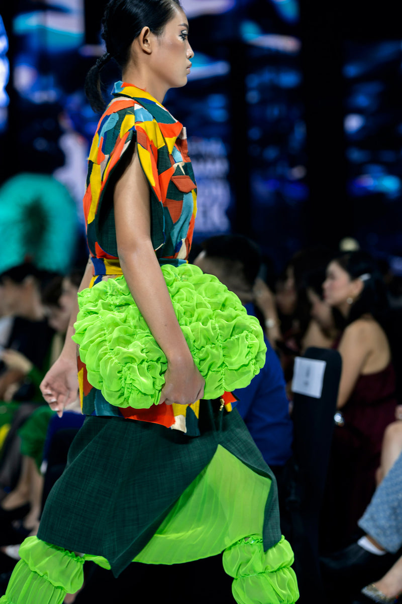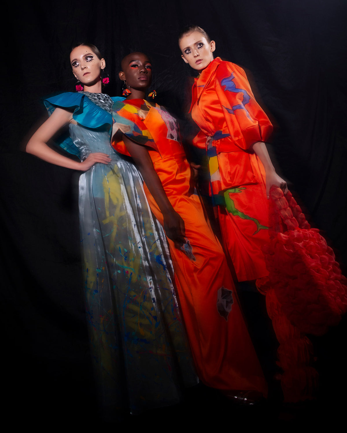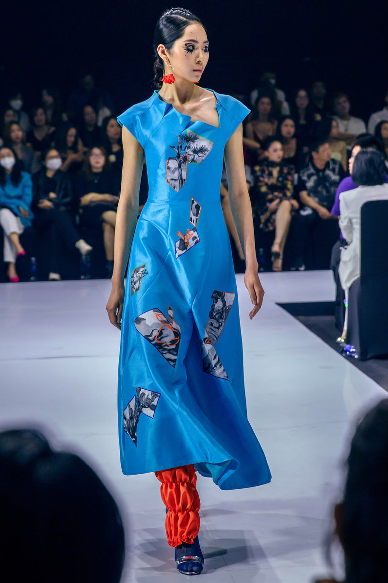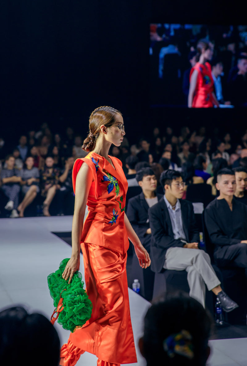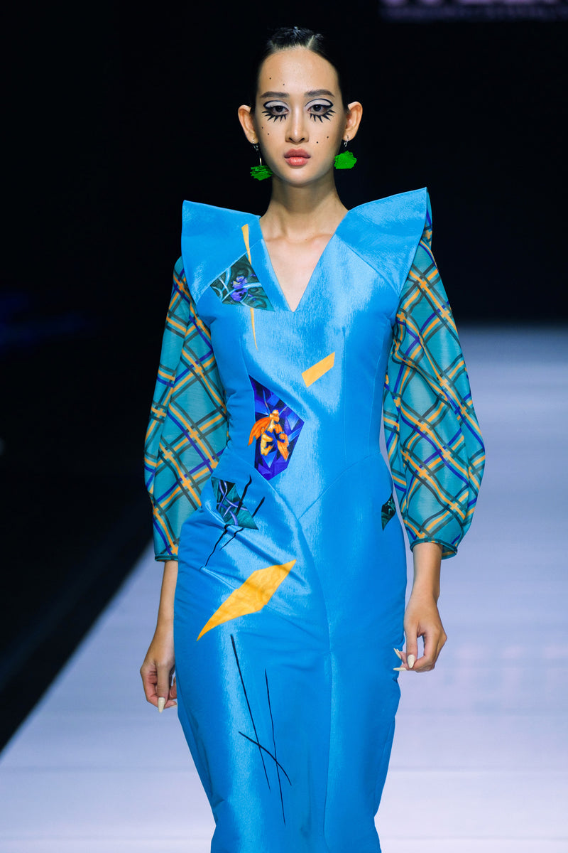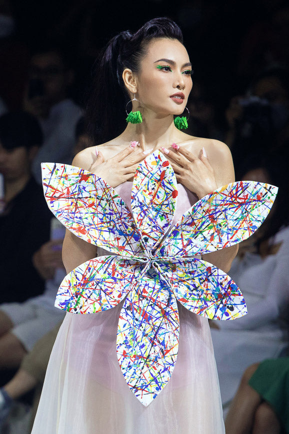 Và trên chỉnh thể hoàn thiện ấy, những bức hoạ vẽ tay thủ công mở ra cánh cửa vào chiều không gian của tâm hồn. Tính đương đại, siêu thực pha trộn cùng sự biểu hiện ngẫu hứng mang đến những góc nhìn đa diện và hoà sắc đậm chất hội hoạ. Người xem như cảm nhận được nhịp đập năng lượng của đất theo từng mảng hoạ tiết chuyển động trên nền chất liệu, và những mảng màu tượng trưng cho tính đa diện của viên ngọc quý tạo nên chiều sâu không gian, phản ánh tính đa chiều của mỗi câu chuyện trên từng trang phục. Giá trị sáng tạo, sự tỉ mỉ thủ công và chất duy mỹ trên mỗi thiết kế đặt trong cái nhìn toàn cảnh tạo nên một tổng thể hoàn mỹ và trọn vẹn.