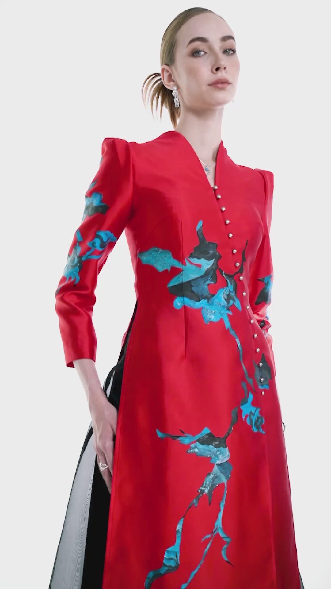 Fiery Elegance – Tôn vinh sự thanh lịch táo bạo và nghệ thuật rực rỡ. Lấy cảm hứng từ nguồn năng lượng sống động của những đoá hoa đang nở rộ và sức hút của những đường nét tự tin, chiếc áo dài đỏ này mang đến sự quyến rũ vượt thời gian. Những hoạ tiết hoa vẽ thủ công gợi lên hình ảnh cánh hoa rực cháy trong chuyển động, được tô điểm duyên dáng bởi cấu trúc thiết kế được may đo tinh xảo. Fiery Elegance dành riêng cho người phụ nữ hiện đại, người luôn bước đi với sự tự tin, thanh tao và niềm đam mê không thể phủ nhận dành cho cuộc sống.