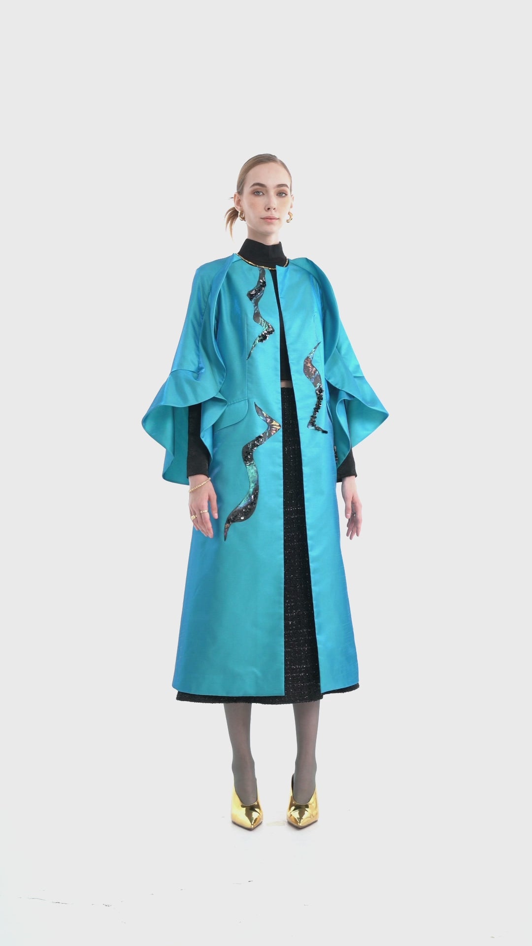 Poppy of The Moon - Lấy cảm hứng từ vẻ đẹp thanh thoát của những đêm trăng, chiếc áo khoác chứa đựng sự huyền bí của họa tiết hoa trừu tượng kết hợp với sự thanh lịch của một bóng hình liệng xuống. Các chi tiết được vẽ thủ công lấp lánh và thêu sequin tinh xảo gợi lên sự rạng rỡ tinh tế của những bông hoa anh túc dưới ánh trăng đang đung đưa nhẹ nhàng trong làn gió đêm.
