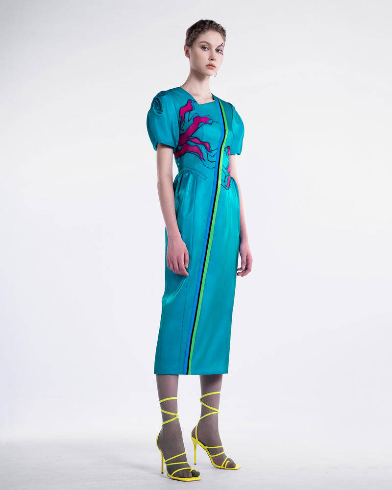 Abstract Flower - Đầm Midi Xanh Cobalt Teal Bất Đối Xứng