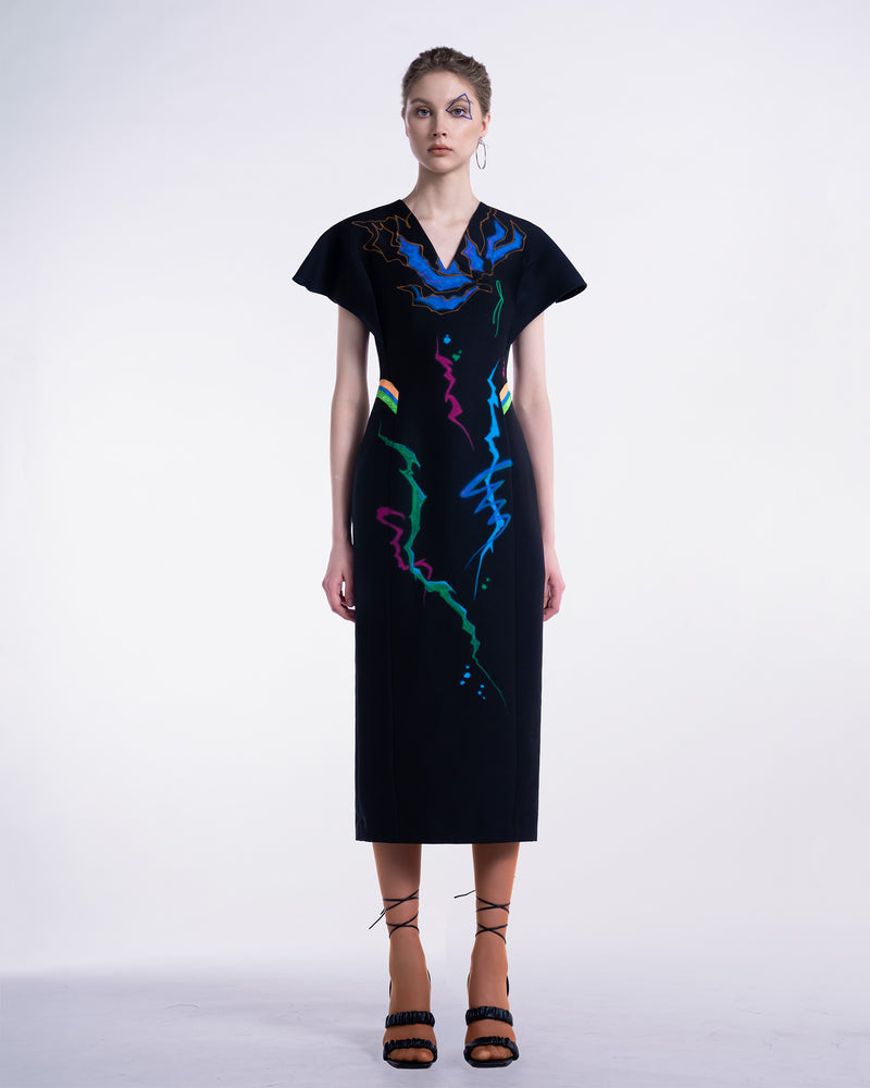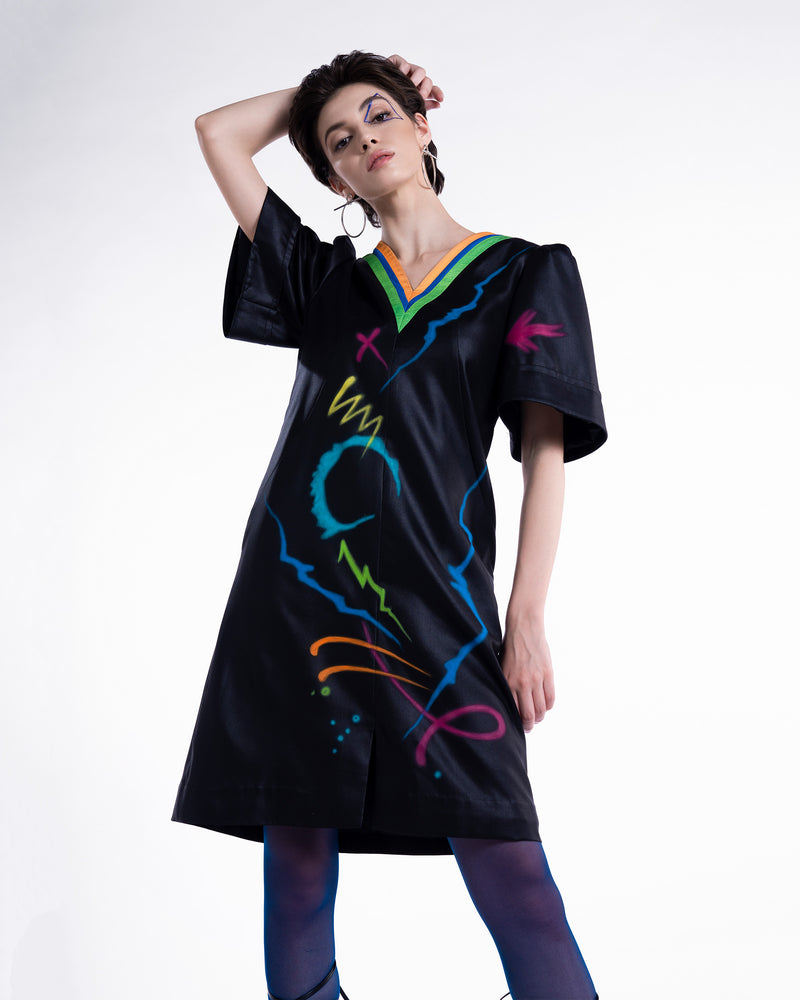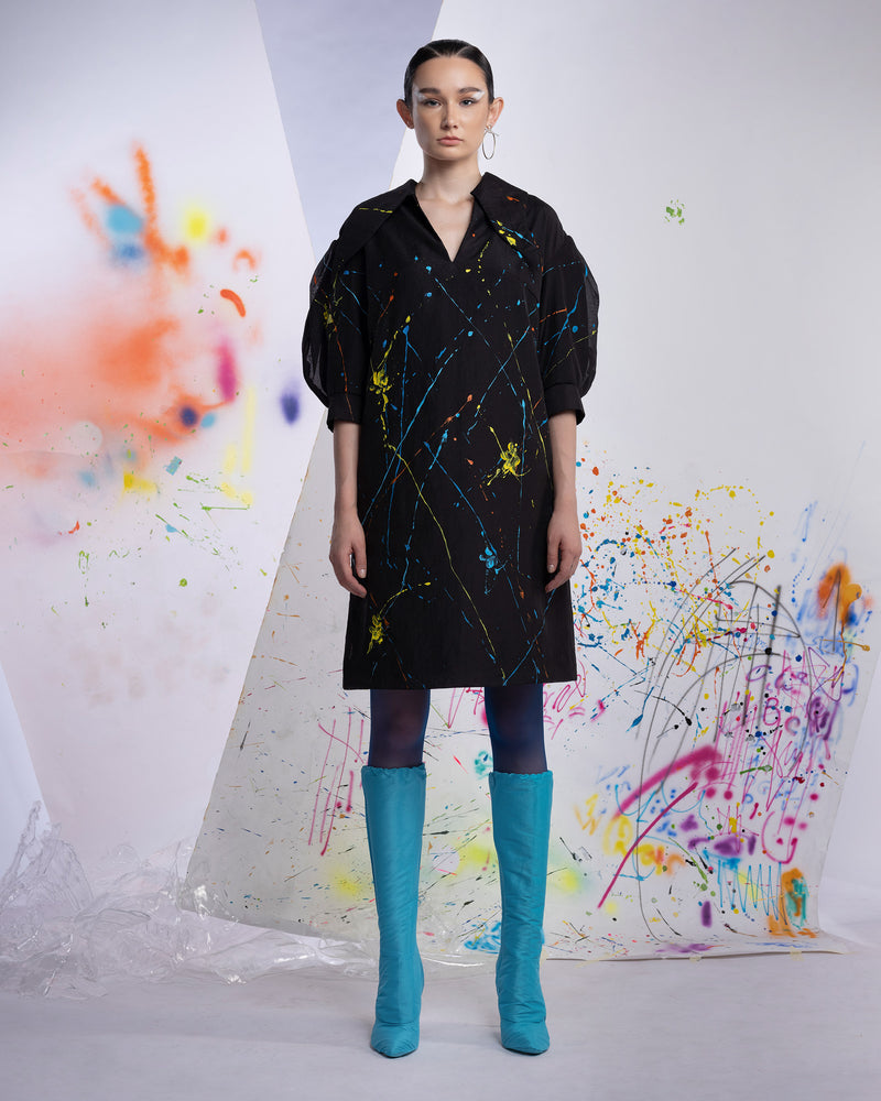 Những Vết Cào Màu Sắc - Đầm Suông Đen Cổ V Phối Màu