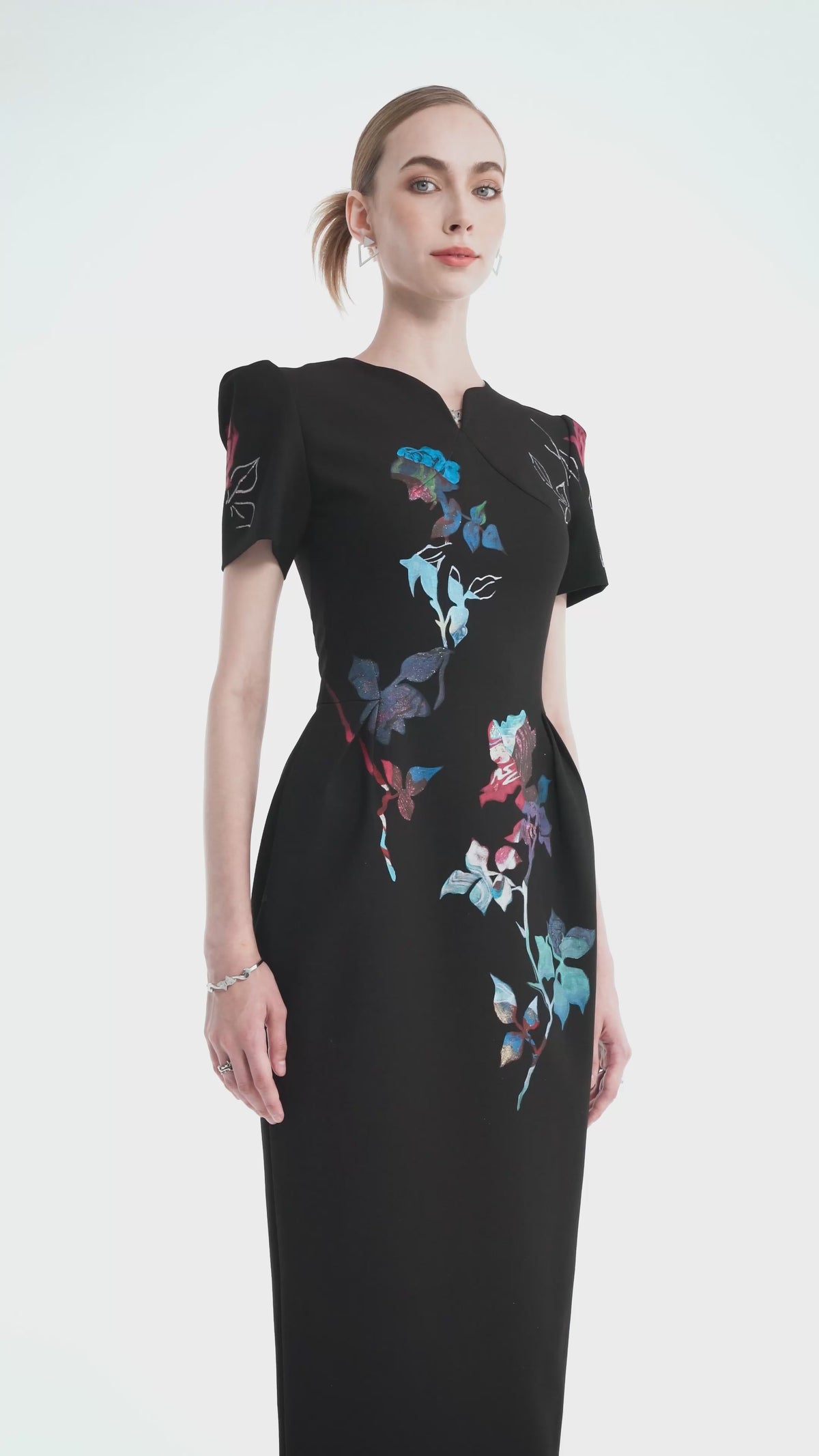 Phản chiếu- chiếc đầm thể hiện Sự phản chiếu của những trải nghiệm sống động. Được chế tác tỉ mỉ đến từng chi tiết, chiếc đầm có chốt màu đen này có họa tiết hoa vẽ tay trừu tượng gợi lên cảm giác tinh tế nghệ thuật. Những bông hoa nhiều màu sắc như những nốt nhạc cộng hưởng tuyệt đẹp trên nền đen mang đến không khí huyền bí và quyến rũ.